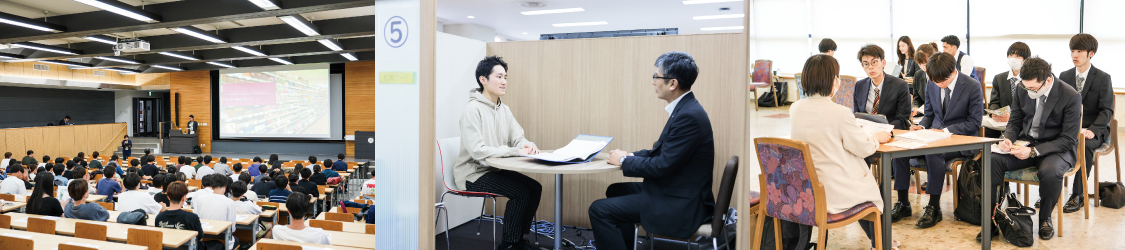 就職活動をする上でペースメーカーとなるのが、3年次6月から行われる「就職ガイダンス」とテーマ別講座です。就職活動の時期別に必要とされる知識やアクションを、指導経験豊富な担当者がアドバイスします(エントリーシート対策、面接対策、就職活動マナー講座、グループディスカッション講座など)。また、企業参加型のイベントも充実しています(OB・OGから学ぶ業界・職種研究セミナー、仕事研究セミナーなど)。