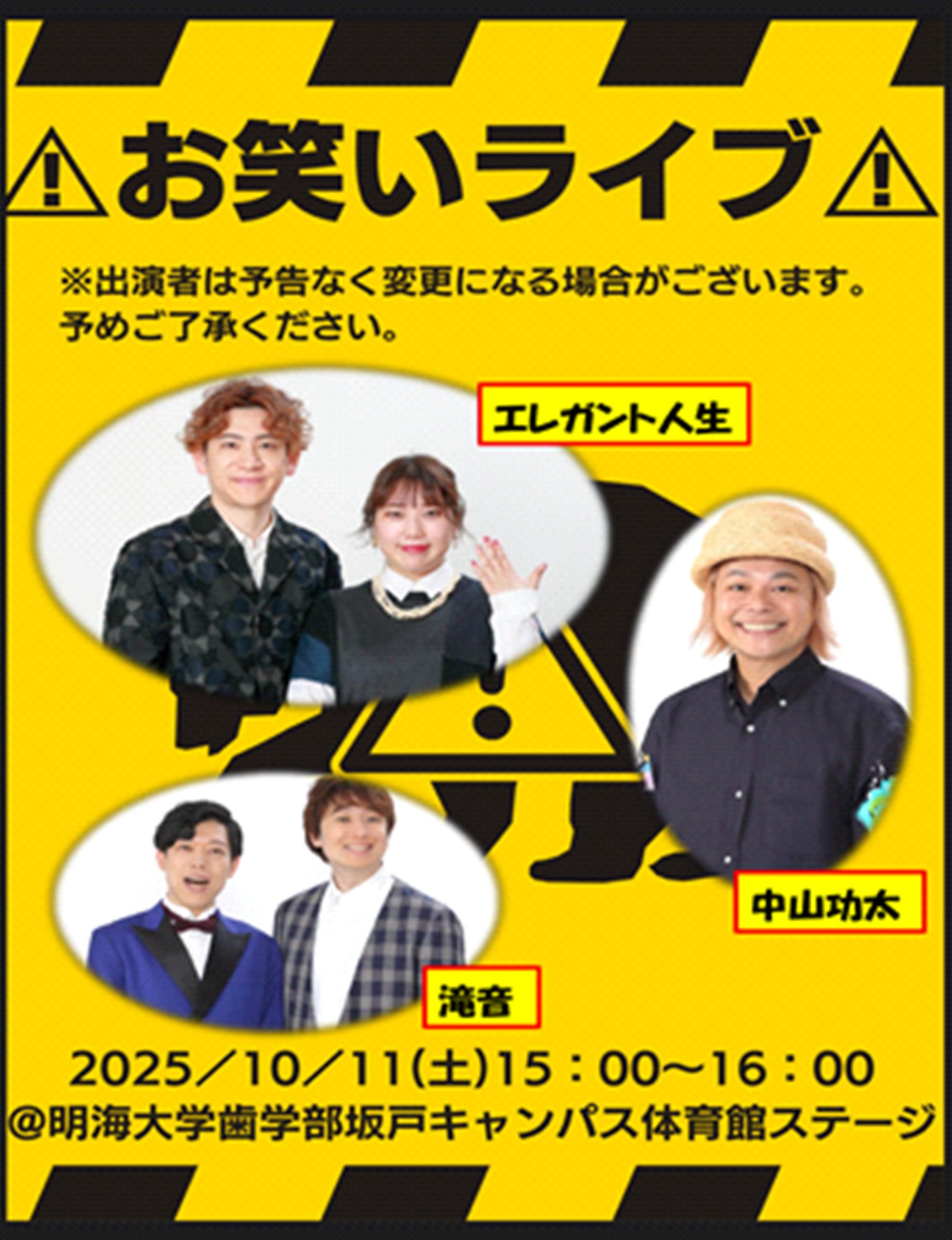 第55回歯学部学園祭「けやき祭」の開催について(坂戸:10/11、10/12) 開催日時 2025年10月11日(土)、12日(日)11:00~18:00 テーマ Beyond(その先へ) 主な内容 ・お笑いライブ(10月11日(土)15:00~16:00) ※出演者は予告なく変更する場合がありますのでご了承ください。 ・ステージ発表(軽音楽部・オーケストラ部) ・骨密度測定・口腔微生物測定 ・ビンゴ大会 ・のど自慢大会 ・キッチンカー出店 ほか