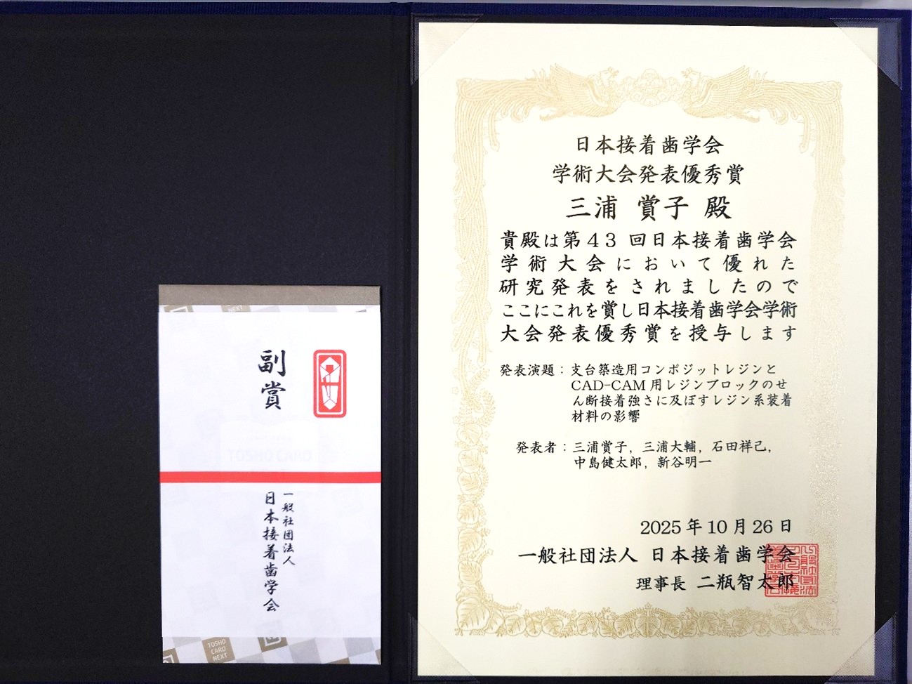 歯学部三浦賞子准教授が「第43回日本接着歯学会学術大会発表優秀賞」を受賞 歯学部の三浦賞子准教授(機能保存回復学講座クラウン・ブリッジ補綴学分野)が、「第43回日本接着歯学会学術大会発表優秀賞」を受賞しました。本賞は、前年の学術大会で優れた研究発表を行った研究者に贈られるもので、表彰式は、10月25・26日に日本大学歯学部で開催された第44回学術大会の場で行われました。