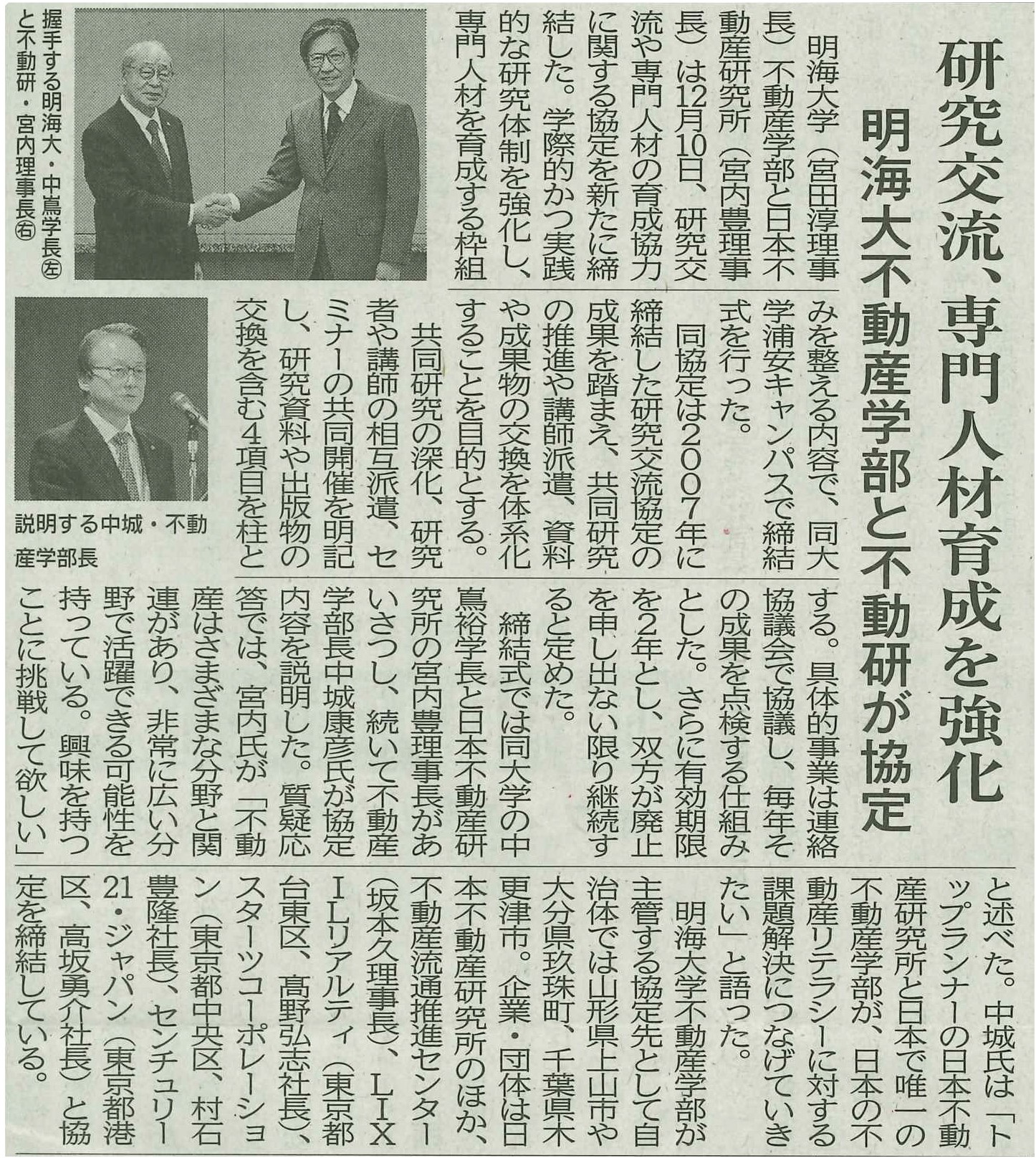 一般財団法人日本不動産研究所との協定締結式の様子が不動産専門紙で紹介されました 12月10日に開催された、本学と一般財団法人日本不動産研究所との研究交流及び専門人材の育成協力に関する協定締結式の様子が、不動産専門紙「週刊住宅」および「住宅新報」で紹介されました。 「週刊住宅」12月15日号 週刊住宅 2025年12月15日号/週刊住宅記事掲載了承済み 「住宅新報」12月16日号 オンラインでご覧の場合は登録会員専用サイトのため、閲覧認証が必要です。 記事はこちら
